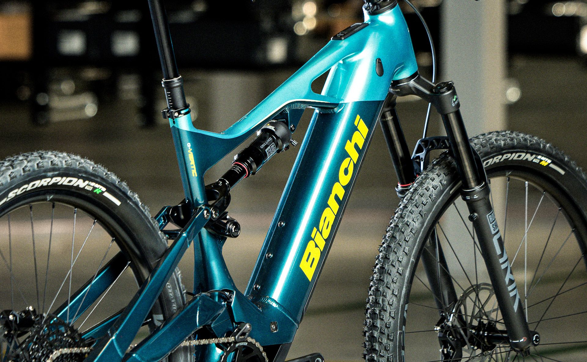 Bianchi e-Vertic FX, aluminium, 12x148 mm rear thru axle, Post mount 180 disc brake type, Front travel 150 mm, Rear travel 140 mm, Internal cable routing in steerer, 800 Wh battery compatible, sizes 40-44-48-53